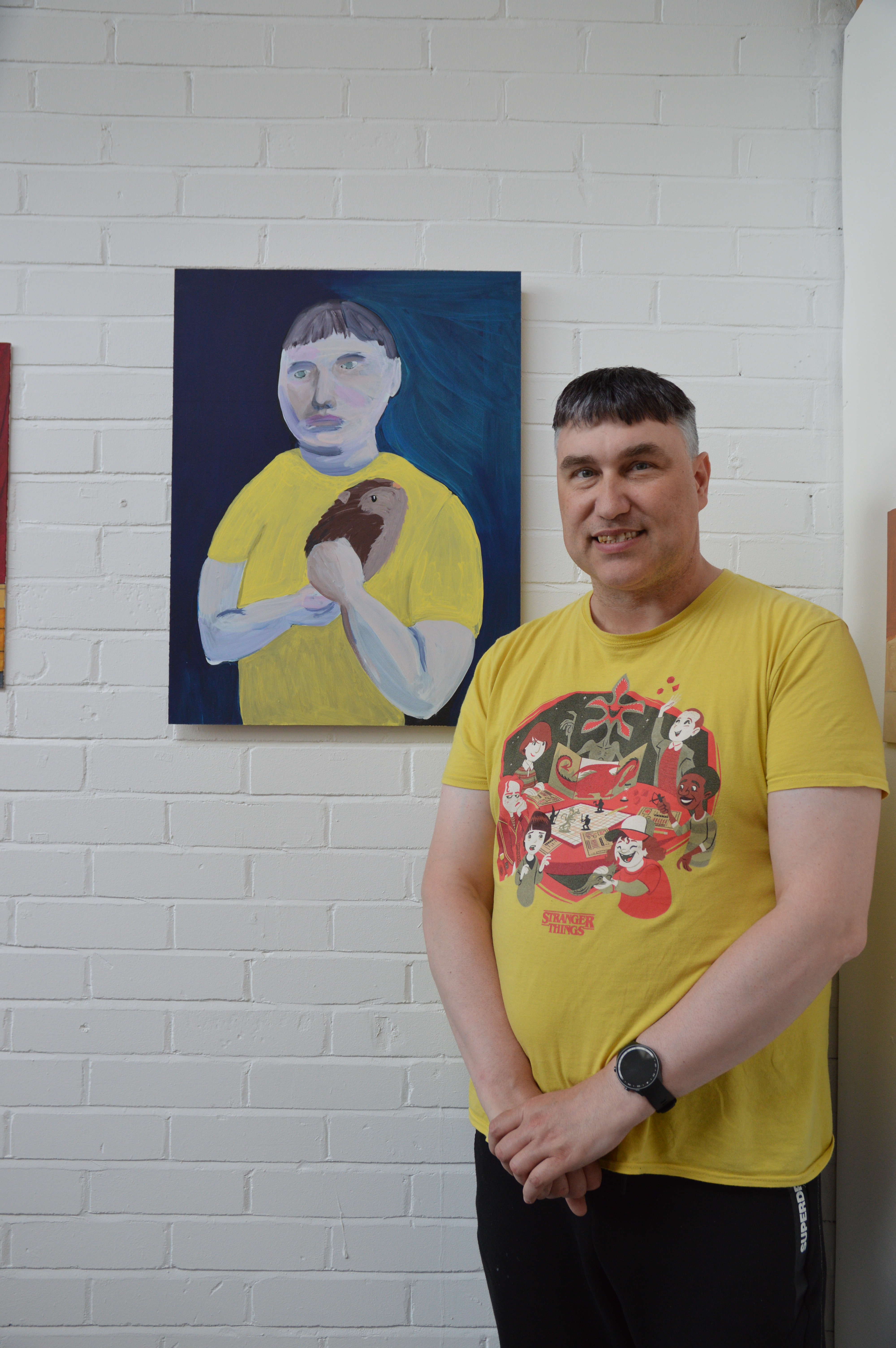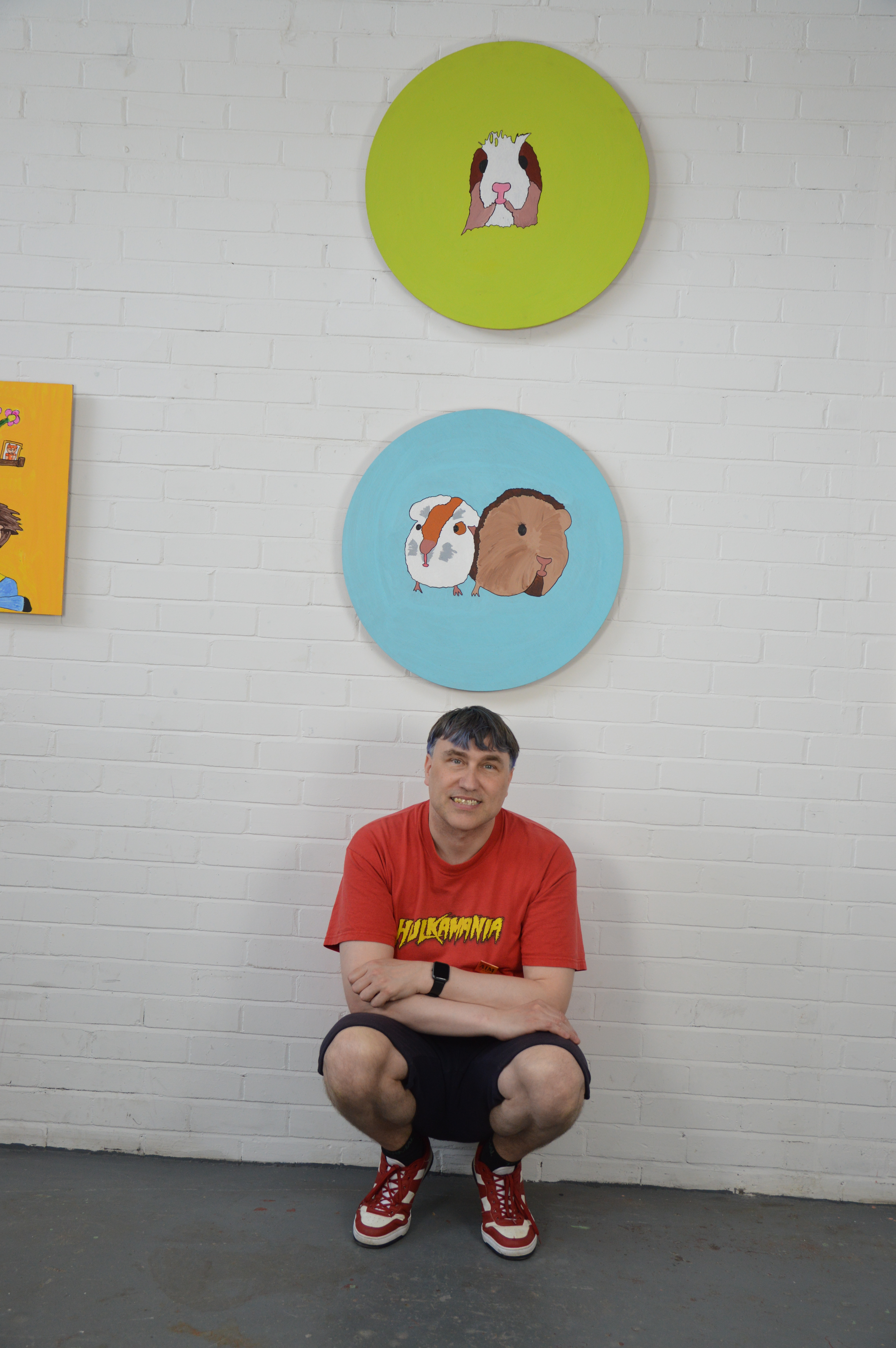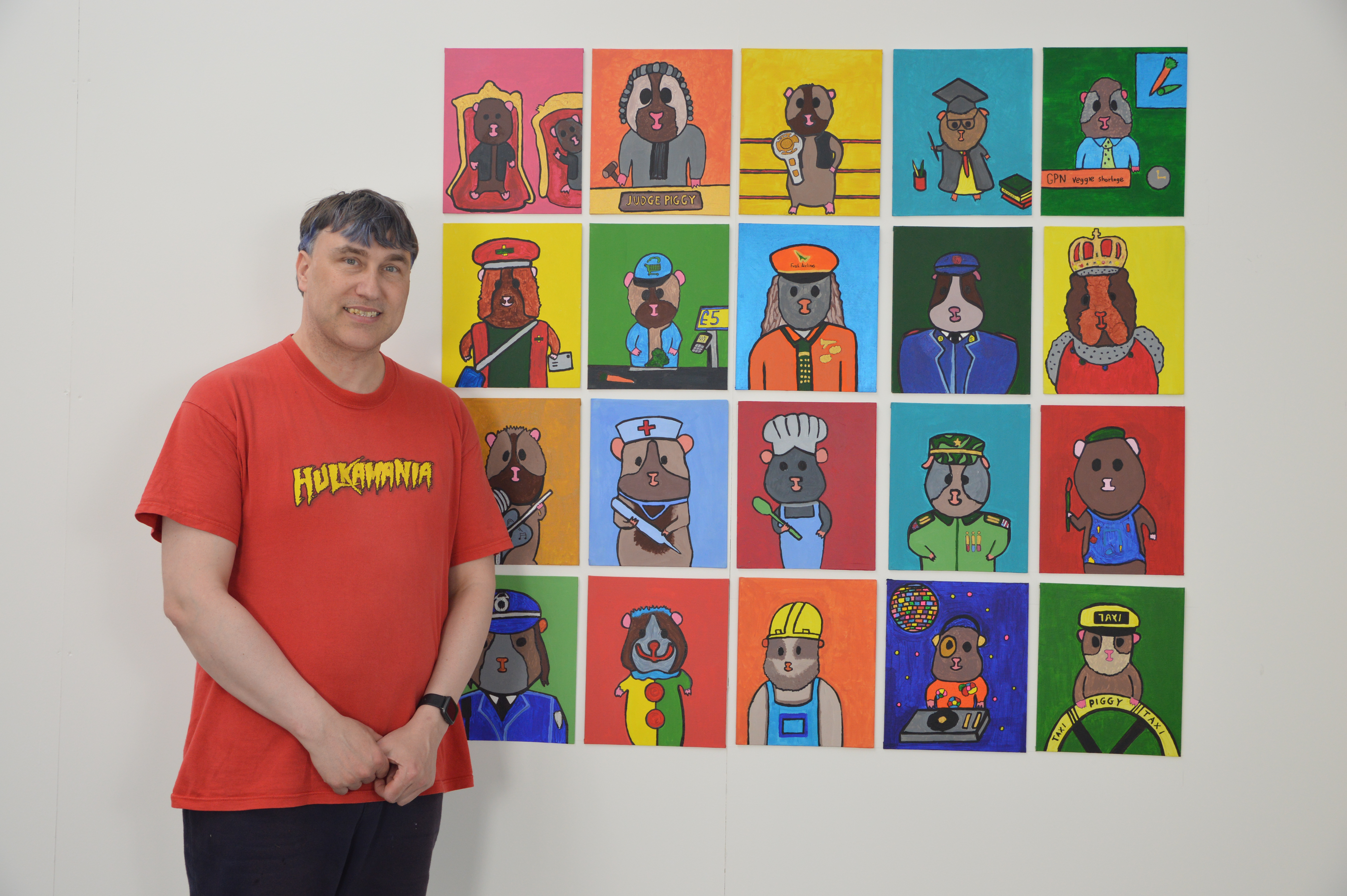 “In my work, I enjoy painting, photography, and making things with cardboard. I’ve been making art since school, and the main themes are guinea pigs and pop art cartoons. I enjoy doing art as it helps me relax, and makes me feel good.